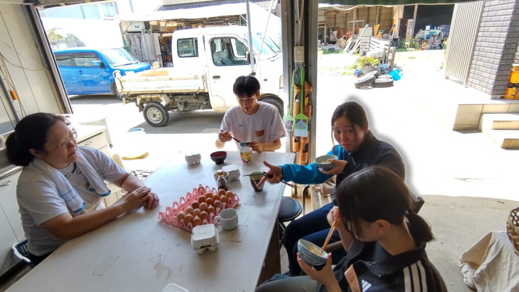 ところでつるじい農園といえば、「つるじいの卵」! たくさんのニワトリが平飼いされていて、私たちも見学させていただきました。つるじいが鶏と戯れる姿は見ていて微笑ましく、活動後にはこの卵で卵かけごはんをいただきました。黄身は淡い黄色で、そのままでも旨みがあり、とても美味しかったです。おすすめです。