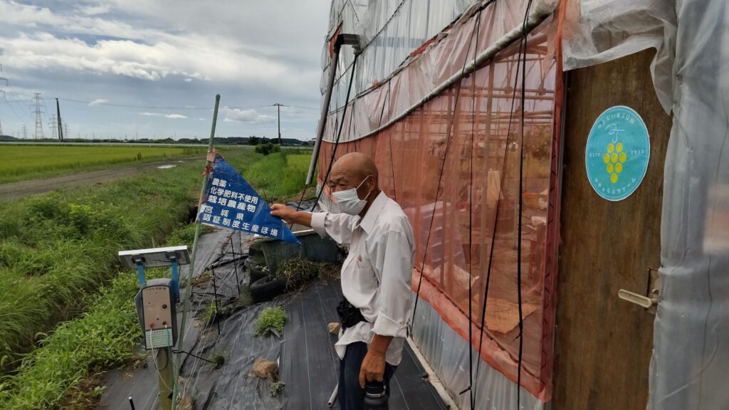この農園は種類が豊富で、ぶどう畑をはじめ、トマト、ナス、きゅうり、オクラなどさまざまな野菜が育っています。農薬や化学肥料を使わないのが大きな特徴で、つるじいはそのこだわりを誇らしげに語ってくれました。