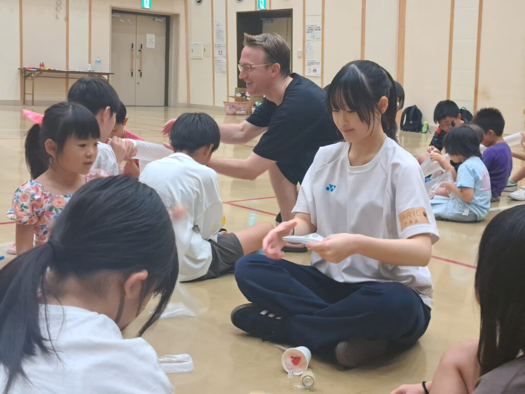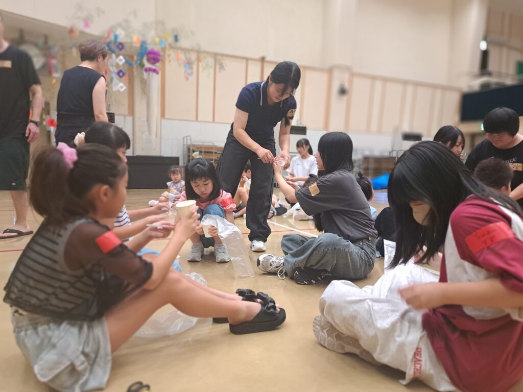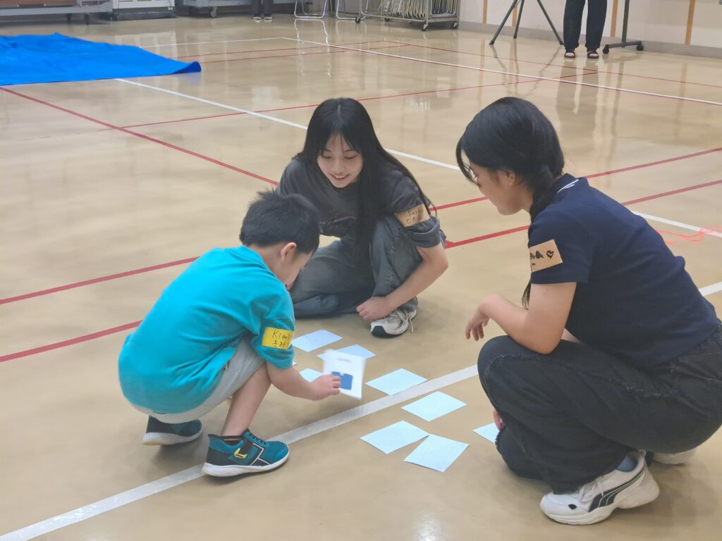 朝から工作のお手本作りや障害物競走のコースを準備したりと、ワクワクしながら準備に取り掛かりました。子供達が集まり始めると、高校生から子供たちに話しかけ、すぐに仲良くなっていました。
