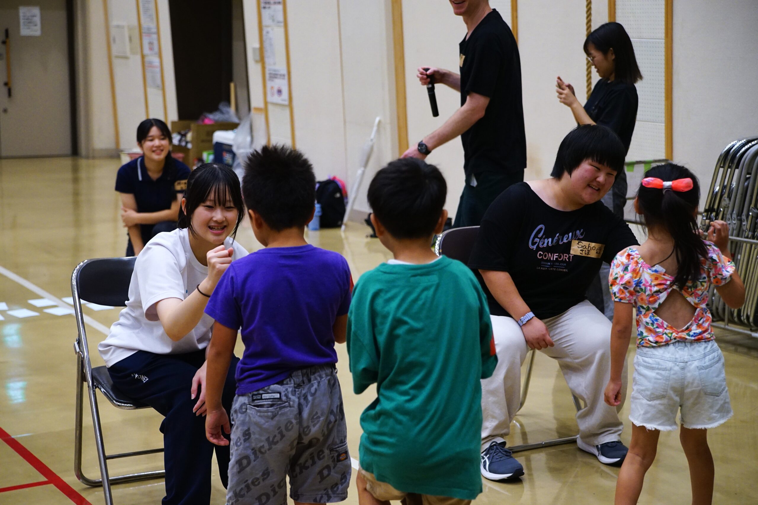 朝から工作のお手本作りや障害物競走のコースを準備したりと、ワクワクしながら準備に取り掛かりました。子供達が集まり始めると、高校生から子供たちに話しかけ、すぐに仲良くなっていました。