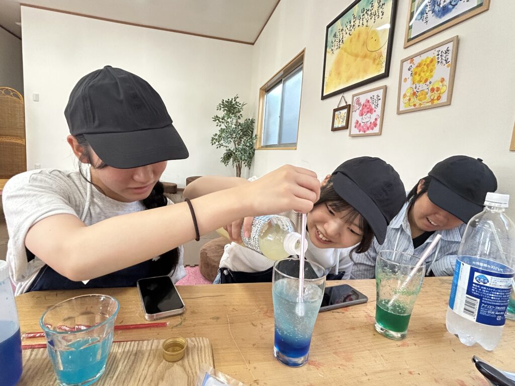 商品開発では、青いゼリーとレモン味のジュースをどうすれば混ざらずに層になって見えるかをみんなで考えました。実際に何度も試してみて、入れる順番や量を変えて工夫しながら、きれいに分かれた時には大きな達成感がありました。試行錯誤の過程そのものが楽しく、協力して考えることで「ものを作り上げる面白さ」を強く感じました。