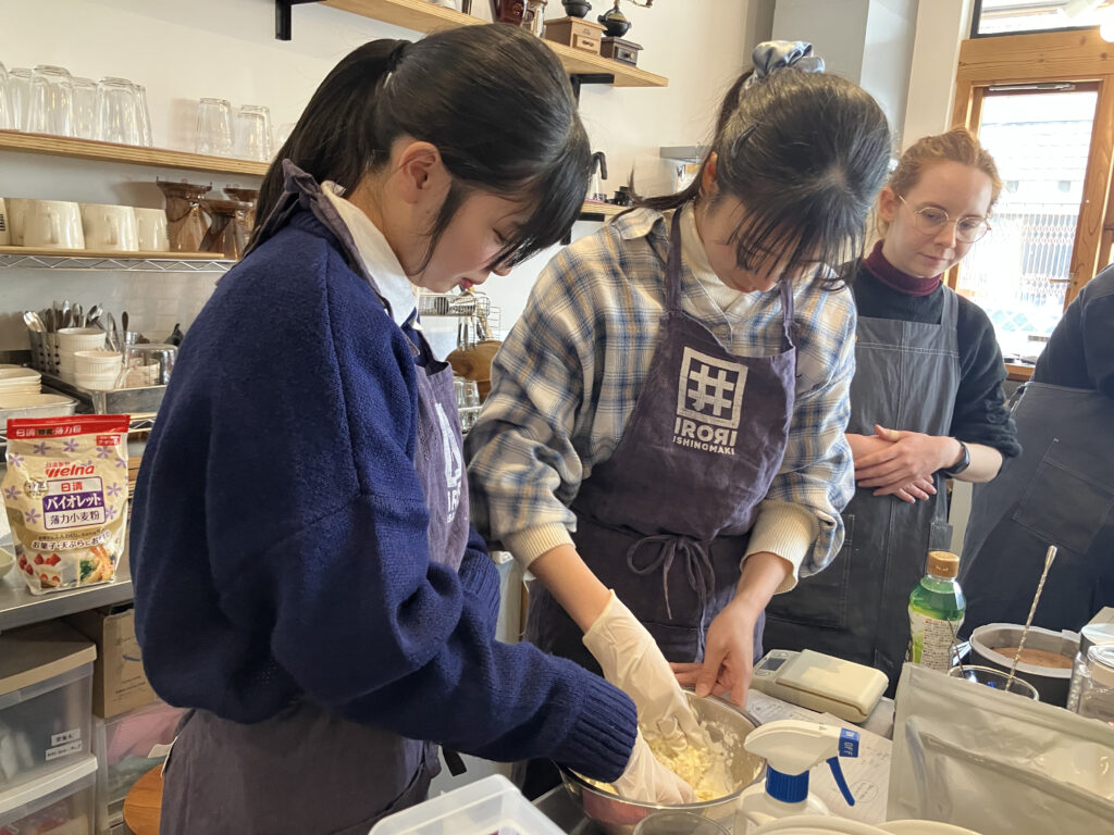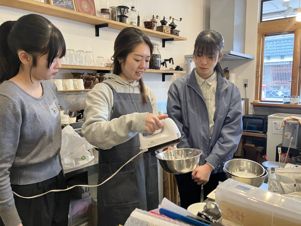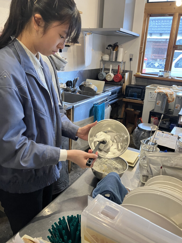 掃除後はカフェ業務に入り、まず材料や道具の場所を教わりました。その後、ホイップクリーム作りでは卵白と生クリームをそれぞれ泡立て、最後に合わせる工程を体験しました。普段見ることの少ない仕込み作業に、高校生たちも興味深く取り組んでいました。
