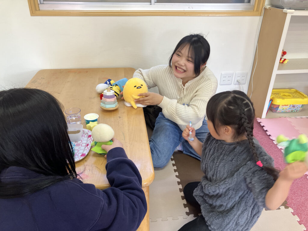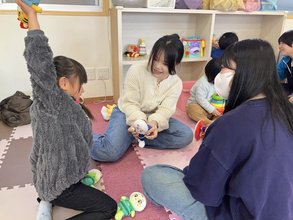また、おもちゃ遊びだけでなく体を使った遊びにも積極的に取り組む姿が見られました。1日目の経験を活かし、子どもの様子に合わせて関わり方を変えている点がとても印象的でした。