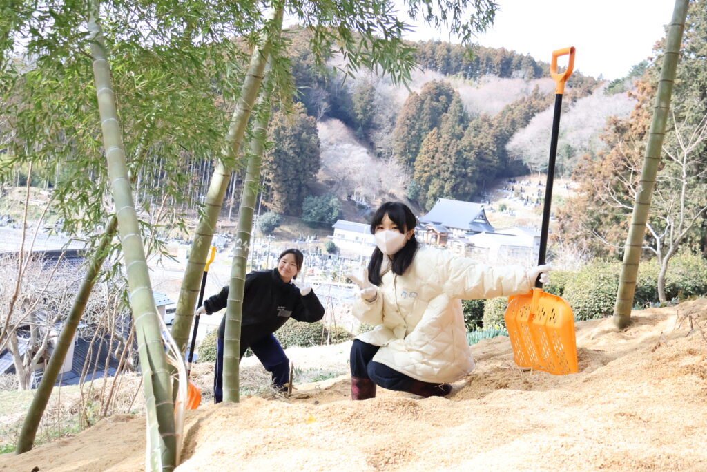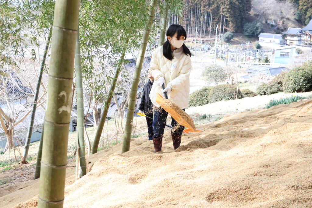 最初の作業は、5月頃に収穫を迎えるたけのこに籾殻(もみがら)を被せる作業です。