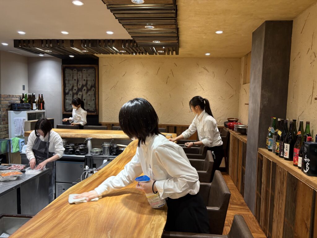 食事の後は、4人で分担して店内の床やテーブルを掃除し、お客様を迎える準備を整えました。